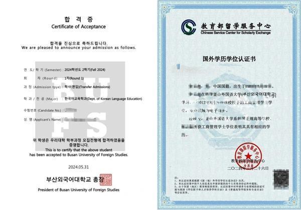 釜山外国语大学录取通知及中留服国外学历学位认证书样本